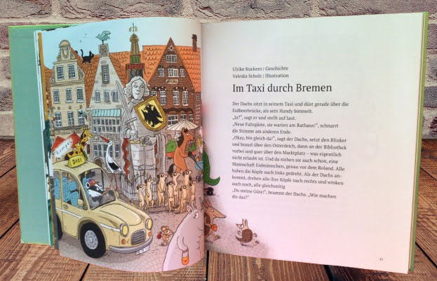 Dann erfahrt ihr auch mehr von der bereits erwähnten großen Tournee der Musikanten, wieso eine Gruppe Erdmännchen erst vor dem Roland pussieren und danach ein Taxi stürmen, ja und was das alles mit dem Weserstadion und vor allem mit den Bremer Stadtmusikanten zu tun hat. Ihr lernt Hendrik Lambertus herrlich gereimt Geschichte von dem Räuber Balduin kennen, die von witzigen Zeichnungen von Ruben Hilgert begleitet wird.